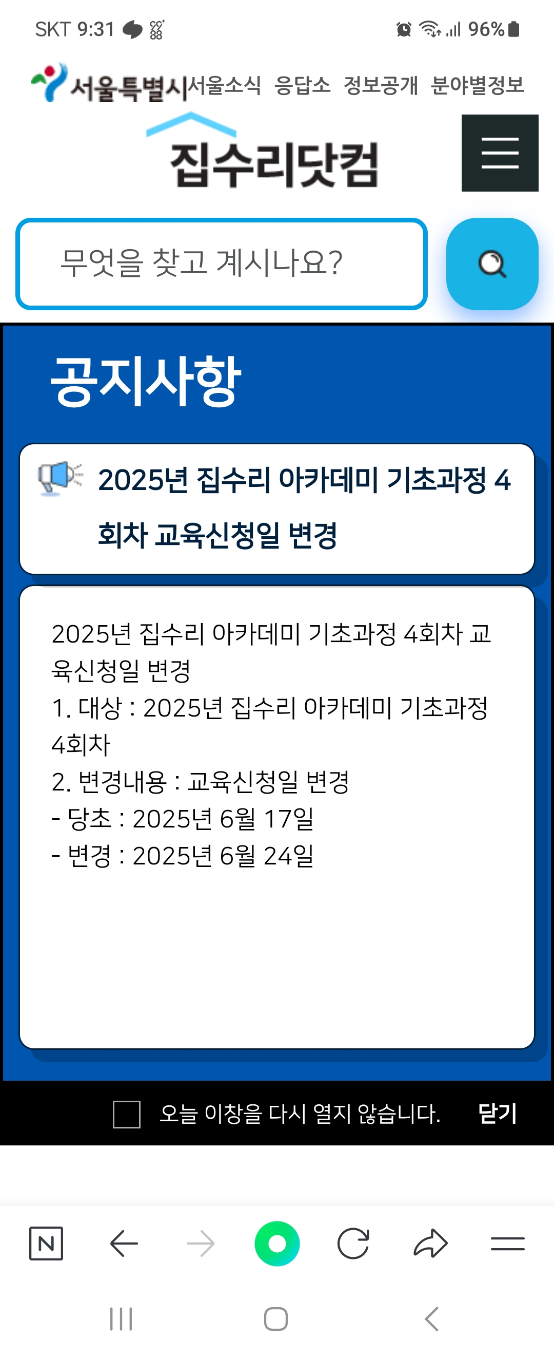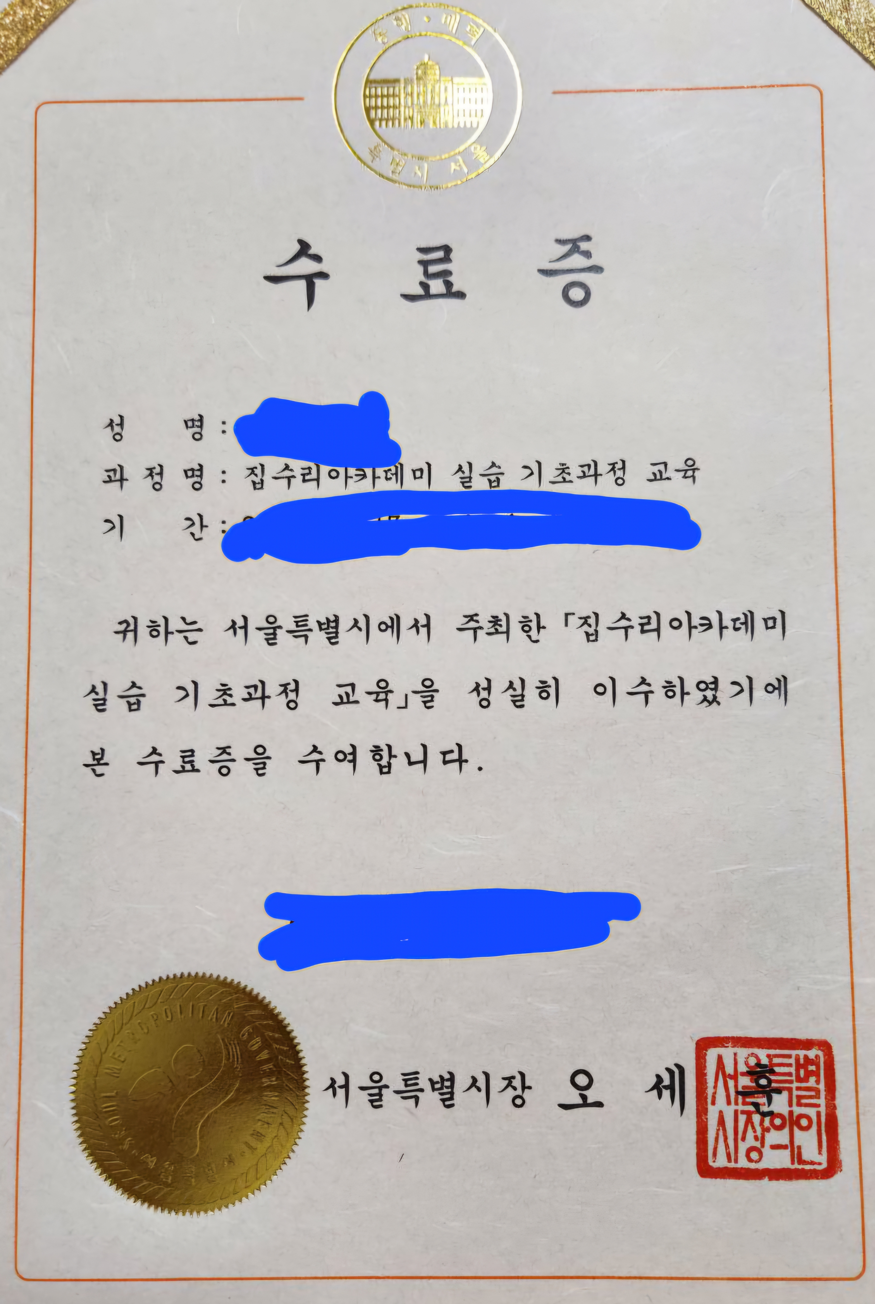 집수리 교육은 모든 세대에 인기. 서울시 ‘집수리아카데미’는 로또(?) 수준. 수강료 8만원. 비싸다고요? 전혀! 공구 사용, 목공, 전기(배선, 기구 등), 수전(세면대, 양변기 등), 인테리어, 문틀(손잡이 등), 타일, 욕실 등 초보에게 딱 맞으면서 다양한 커리큘럼. 돈 좀 들만한 공구들과 재료들을 마음대로 쓴다. 하루 6시간(오전10시~오후5시), 점심이 끼어 괜찮은(?) 도시락도 준다. 재료비는 둘째 치고, 식사비만 따져도 수강비가 아깝지 않다. 특히 실습 현장이 서울에, 대중교통 접근성도 좋다. 민간 교육도 있지만… 전문적인 교육이고, 수십 만원 교육비, 자동차로 가야 하는 한적한 교육장.