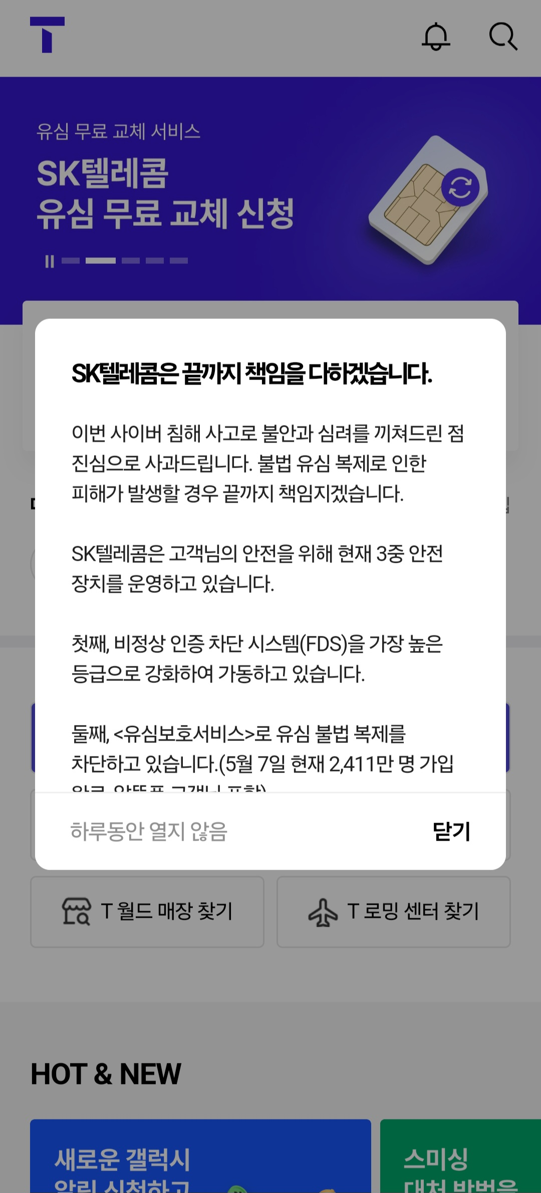 근데, 유심 대란은 뭐지? 그런 거 잘 모르는 노모와 아내까지 난리. 어쩌겠나, 복불복福不福? 동네SK텔레콤 지점에 유심 교체 신청을 했지만… 그냥 기다릴 수밖에… 다만, 괘씸? 30여년 장기, 온 가족 가입 고객인데… 소식은 없고, ‘SK텔레콤은 끝까지 책임을 다하겠습니다’ 안내만 줄창… 일단 하염없이 기다리고, 유심 교체 상황 본 뒤, 중대 결심? (그 경험도 공유 예정)